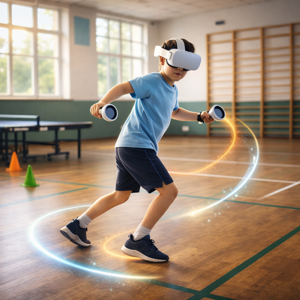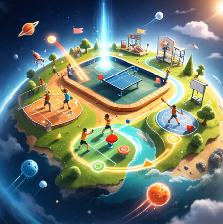 Pingpong Planet transforms table tennis-inspired movement into an immersive VR experience. Children complete short missions that encourage stepping, leaning, reacting and hitting—turning play into whole-body activity without feeling like “training.”